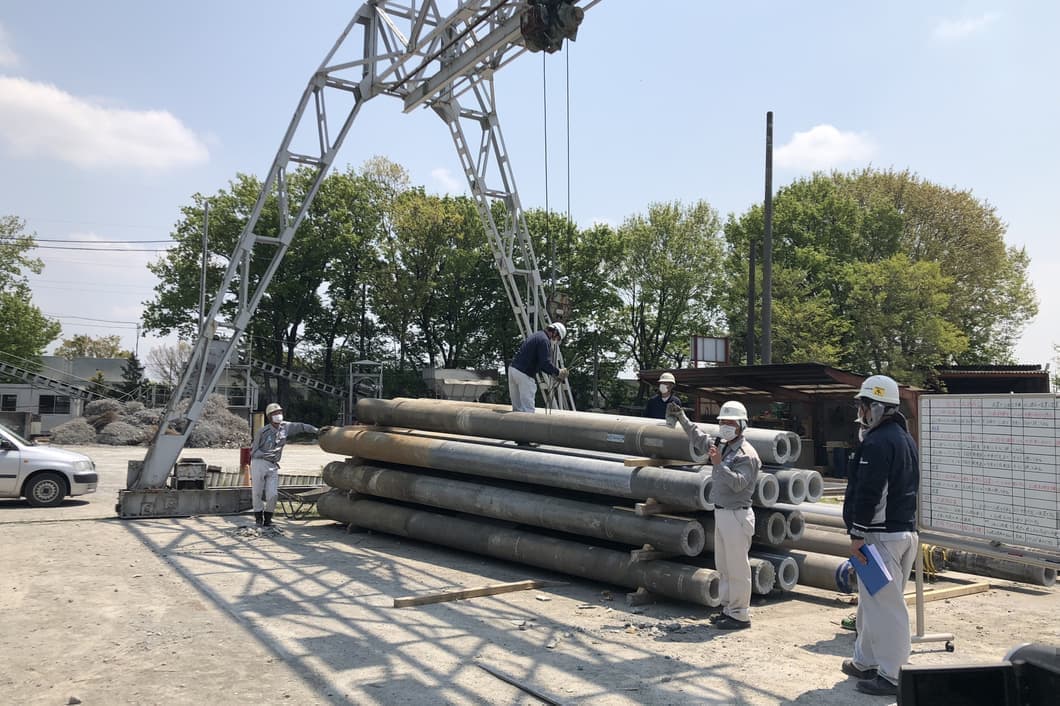 ユニック車を巧みに操り、自分よりもはるかに大きいコンクリート柱を運ぶ