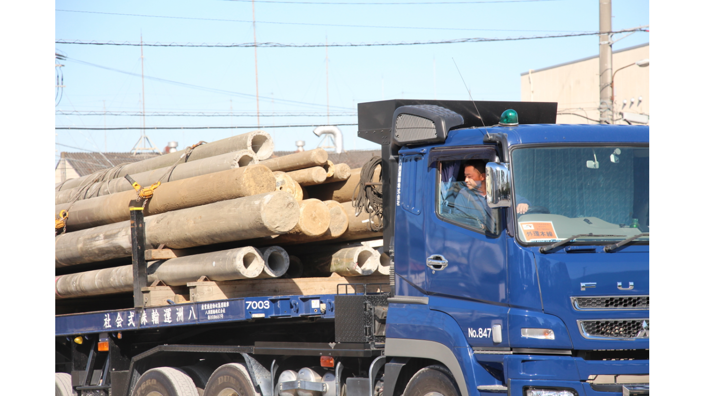 ①前日工場で積み込んだ電柱などを配送